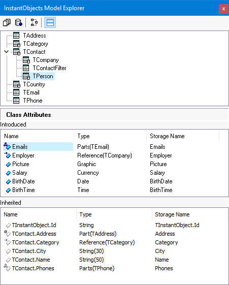 The InstantObjects Model Explorer (with "Inheritance" view ofclasses)