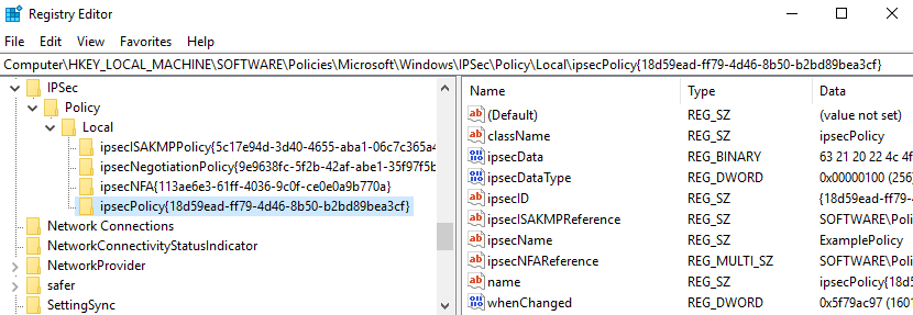 Straight away we can see that attributes for the policy are created, and that there is more registry activity. By searching the registry for these attributes, we can indeed confirm that the details of the policy are written: