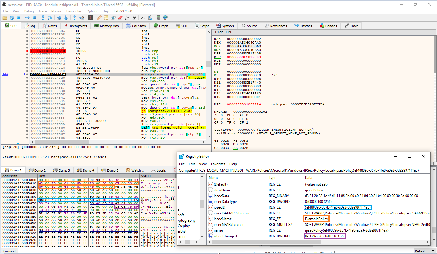 Straight away, we can see that calls to NSHIPSEC.DLL and POLSTORE.DLL are made. Furthermore, we can also see that there are enumerations of registry keys, so it's likely that the policy information is actually stored in the registry.