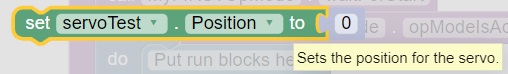 | 12. Drag the “set servoTest.Position to” block so that it snaps in place in the do portion of the “if do” block.