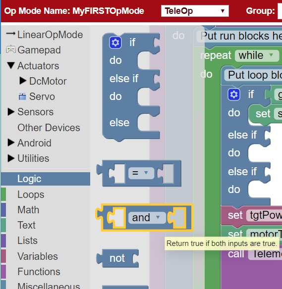 | 16. Click on the “Logic” category and select the logical “and” block.