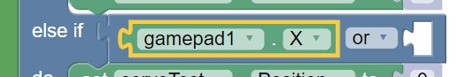| 19. Click on the “Gamepad” category and select the “gamepad1.X” block. Drag the block so that it clicks in place as the first test condition of the logical “or” block.