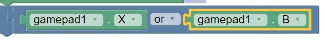 | 20. Click on the “Gamepad” category and select the “gamepad1.B” block. Drag the block so that it clicks in place as the second test condition of the logical “or” block.