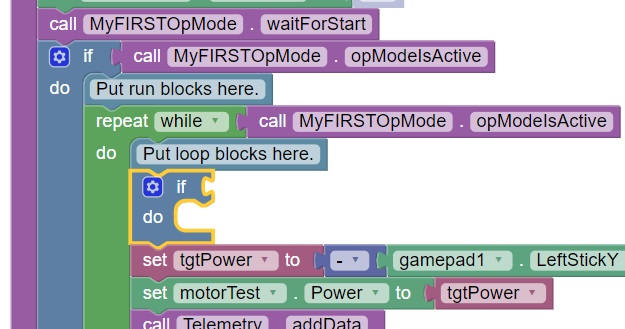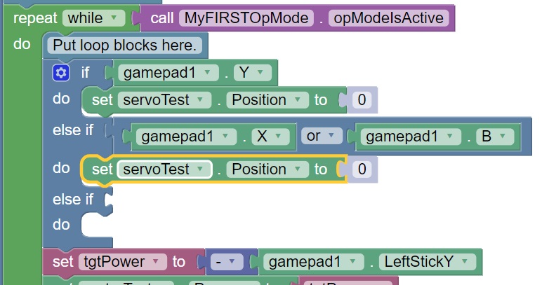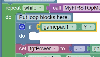 | 9. Drag the “gamepad1.Y” block to the right side of the “if do” block. The block should click into place.