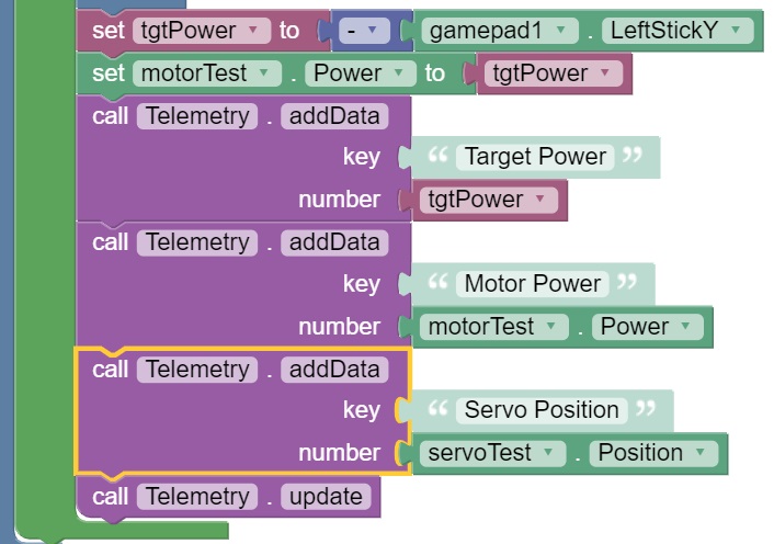 | 24. Insert a “call telemetry.addData” block (numeric) before the “call Telemetry.update” block. Rename the key field to “Servo Position” and insert a “servoTest.Position” block for the number field.