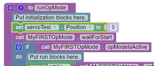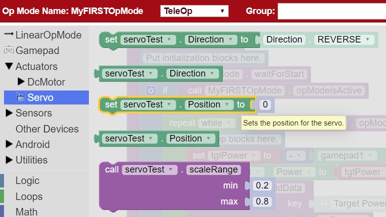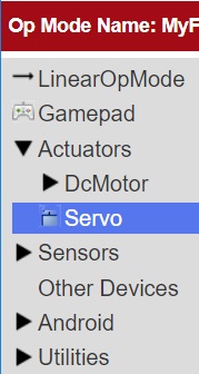In the section titled Writing an Op Mode with FTC Blocks you learned how to use the FTC Blocks Programming Tool to write an op mode that controls a 12V DC motor. In this section, you will learn how to write an op mode that controls a servo motor.