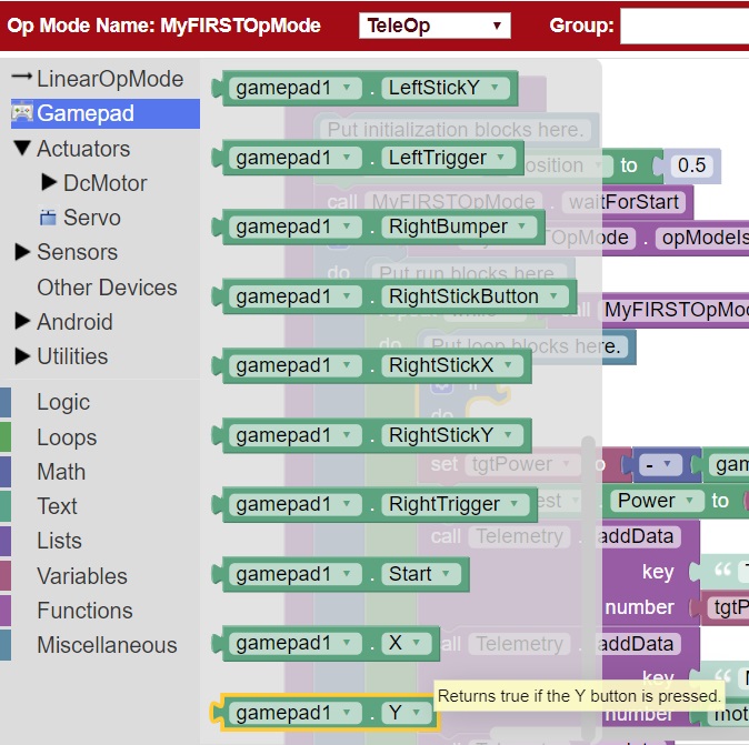 | 8. Click on the “Gamepad” category of the programming blocks and select the “gamepad1.Y” block from the list of available blocks.