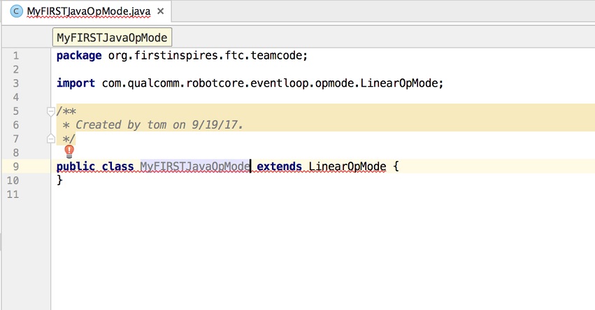 Right mouse click on the "org.firstinspires.ftc.teamcode" package and select New->Java Class from the pop-up menu. The Create New Class dialog box appear. Specify the name of the new class as "MyFIRSTJavaOpMode" and specify as its superclass the class LinearOpMode which is in the package "com.qualcomm.robotcore.eventloop.opmode".