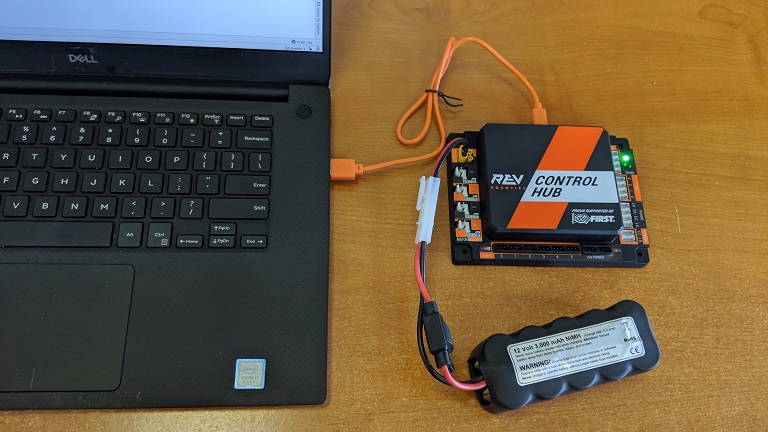 Or, if you are using a Control Hub, verify that the Control Hub is powered by a freshly charged 12V battery, and that it is connected to your laptop through its USB Type C port. Note that the Control Hub should automatically have USB debugging permission enabled.