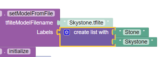 When you load an inference model, you must specify a list of labels that describe the known objects that are included in the model. For the "skystone.tflite" model, there are two known objects. The first object has a label of "Stone" and the second object has a label of "Skystone". Click on the little gear icon for the "create list with" block, and then drag a second item onto the list block, to change the number of items in the list from one to two.