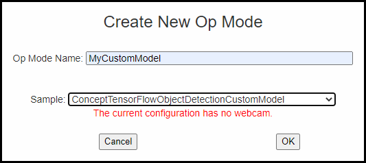 Click on the "Blocks" tab at the top of the screen to navigate to the Blocks Programming page. Click on the Create New Op Mode Button to display the Create New Op Mode dialog box. Specify a name for your new op mode. Select "ConceptTensorFlowObjectDetectionCustomModel" as the sample op mode that will be used as a template for your new op mode. Note that if you do not have a webcam configured for your Robot Controller, the dialog box might display a warning message. You can ignore this warning message. Press "OK" to create your new op mode.