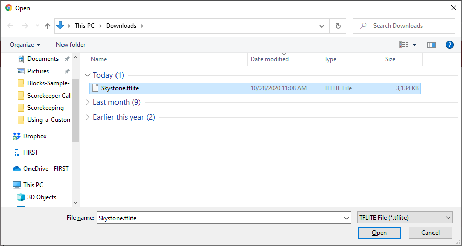 The Robot Controller allows you to load an inference model that is in the form of a TensorFlow Lite (.tflite) file. If you are a very advanced user, you can use Google's TensorFlow Object Detection API to create your own custom inference model. In this example, however, we will use a .tflite file from a prior season (Skystone).