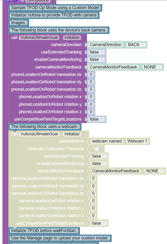 The new op mode should appear in edit mode in your browser. By default, the sample op mode assumes that you are using the smartphone camera with your robot controller. If you are using a webcam, disable the phone-specific initialization block and enable the webcam-specific block.