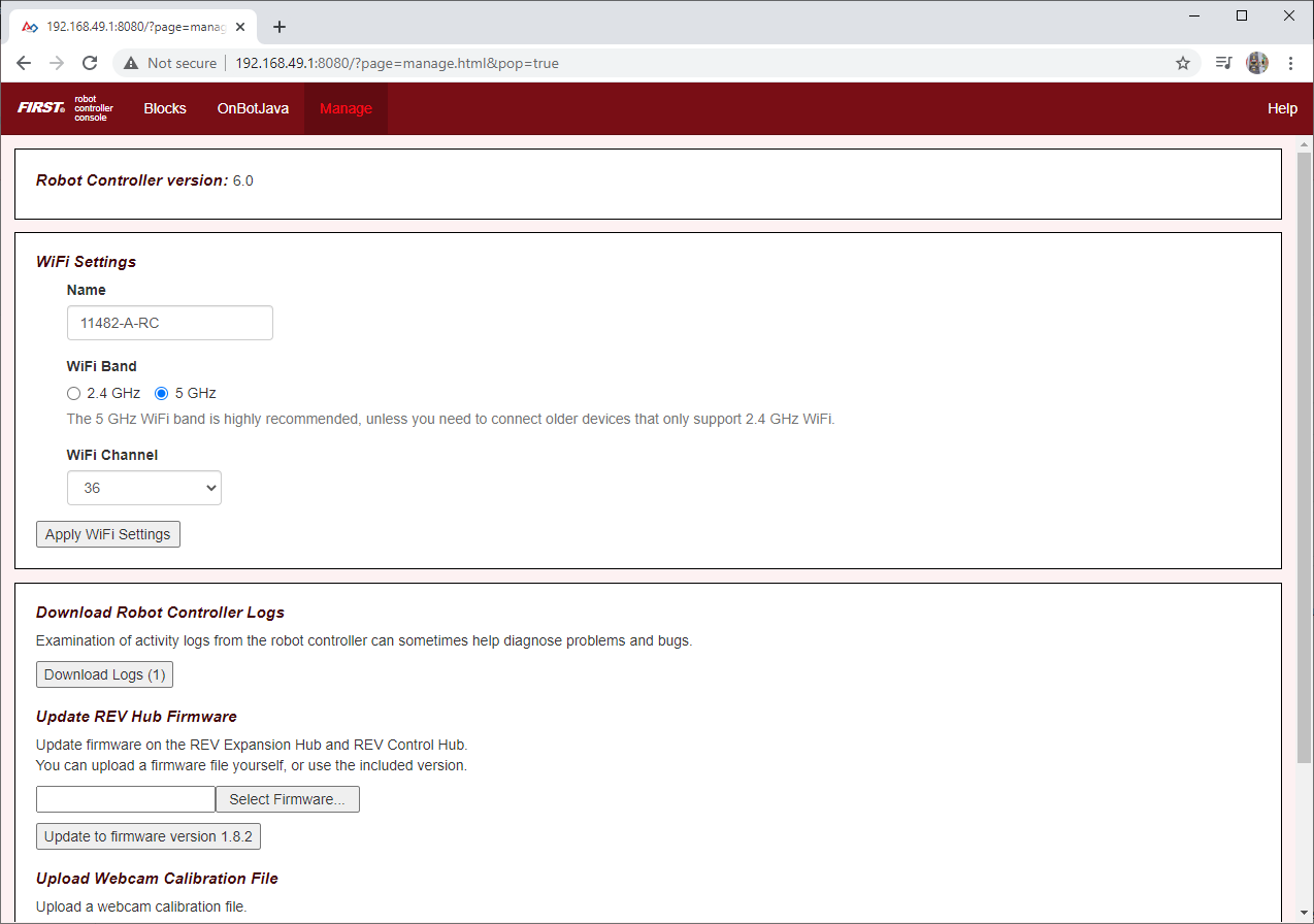 Once you have the file downloaded to your laptop, you need to upload it to the Robot Controller. Connect your laptop to your Robot Controller's wireless network and navigate to the "Manage" page of the system: