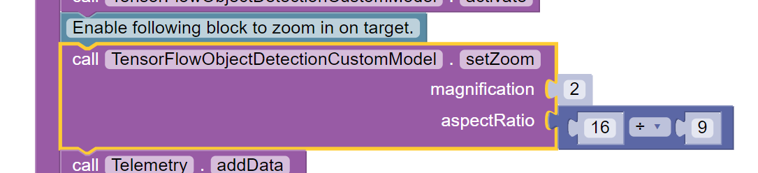 If the object that you are trying to detect will be at a distance of 24" (61cm) or greater, you might want to set the digital zoom factor to a value greater than 1. This will tell the TensorFlow to use an artificially magnified portion of the image, which can result in more accurate detections at greater distances.