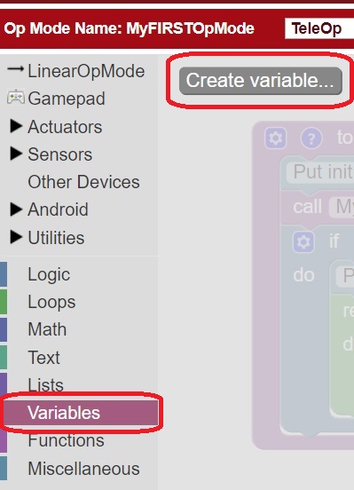 | 1. On the left-hand side of the screen click on the category called “Variables” to display the list of block commands that are used to create and modify variables within your op mode.