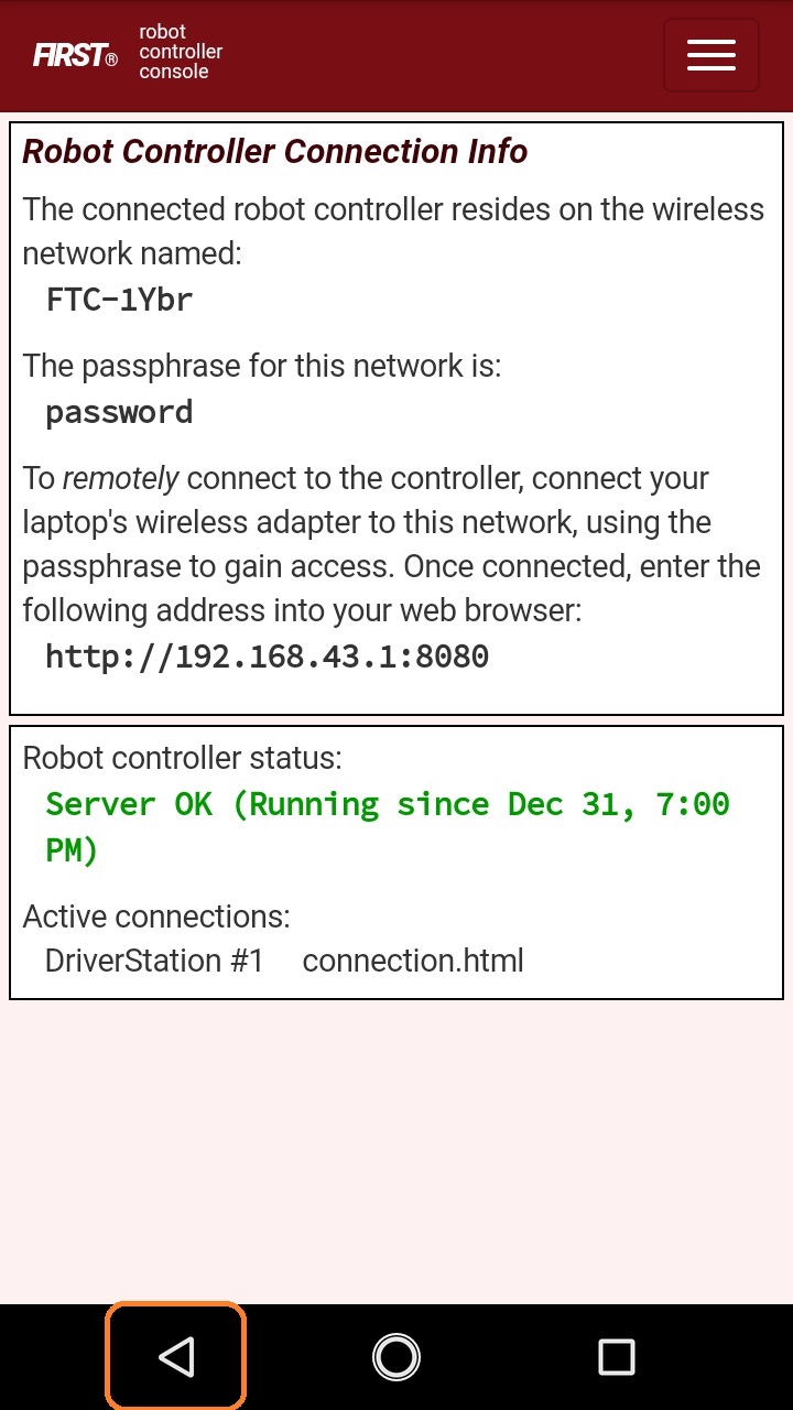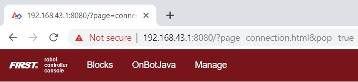 | 1. Launch the web browser on your laptop (FIRST recommends using Google Chrome) and find the web address that is displayed on the Program & Manage screen of the Robot Controller. Important Note: If your Robot Controller is an Android smartphone, then the address to access the Program & Manage server is "192.168.49.1:8080".