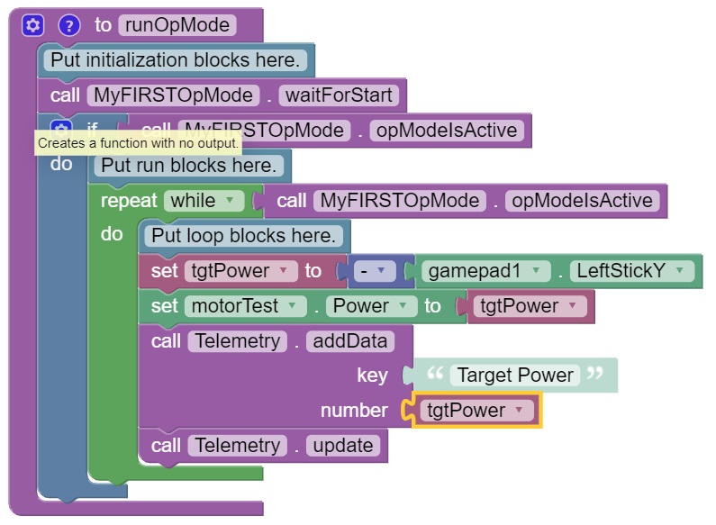 In the figure shown above, the main body of the op mode is defined by the outer purple bracket that has the words “to runOpMode” at the top. As the help tip indicates, this function is executed when this op mode (“MyFIRSTOpMode” in this example) is selected from the Driver Station.