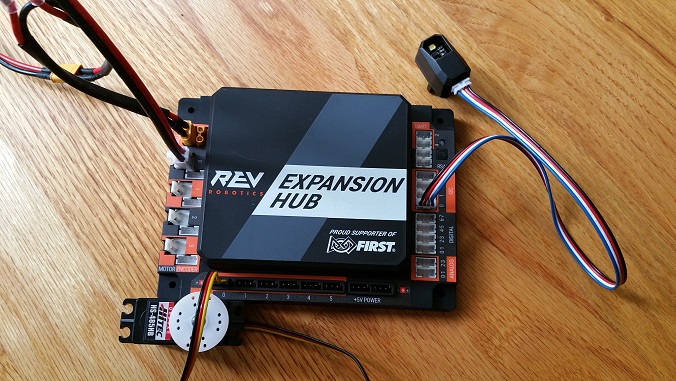 This section explains how to connect a motor, a servo, and some sensors to your REV Robotics Control Hub or REV Robotics Expansion Hub. While the Control Hub differs from the Expansion Hub because of its built in Android device, the layout of the external motor, servo, and sensor ports are identical for the Control Hub and Expansion Hub.