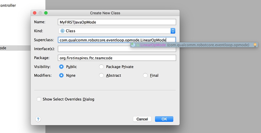 Right mouse click on the "org.firstinspires.ftc.teamcode" package and select New->Java Class from the pop-up menu. The Create New Class dialog box appear. Specify the name of the new class as "MyFIRSTJavaOpMode" and specify as its superclass the class LinearOpMode which is in the package "com.qualcomm.robotcore.eventloop.opmode".