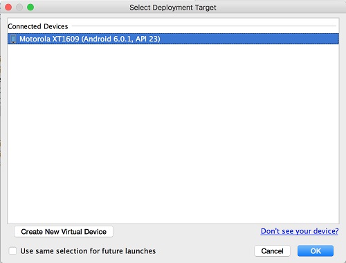 Make sure that you select the correct target device. In the figure above the Motorola phone is selected as the target device. Hit OK to build the APK file and install it on the target device.
