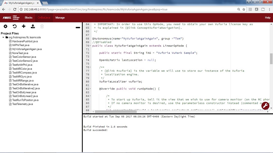 After you have modified your op mode to include these new statements, press the build button and verify that the op mode was built successfully.