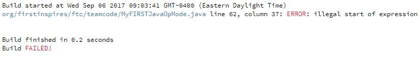 In this example, the problem file is called “org/firstinspires/ftc/teamcode/MyFIRSTJavaOpMode.java” and the error occurs at line 62, column 37. It is important to note that the build process builds all of the .java files on the Robot Controller. If there is an error in a different file (one that you are not currently editing) you will need to look at the file name to determine which file is causing the problem.