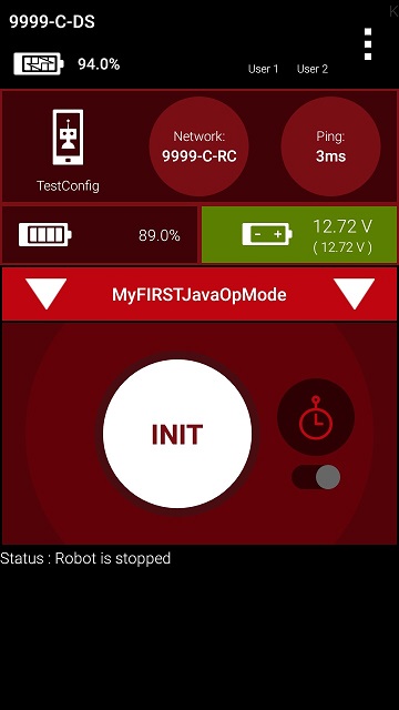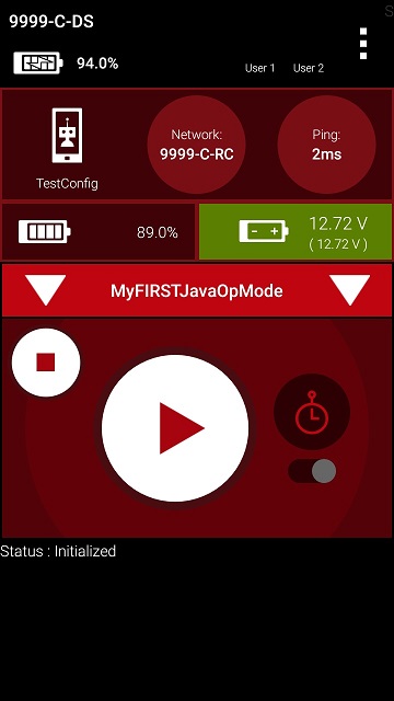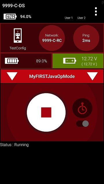 Once you press the start button, the op mode will continue to iterate and send the “Status: Running” message to the Driver Station. To stop the op mode, press the square-shaped stop button.
