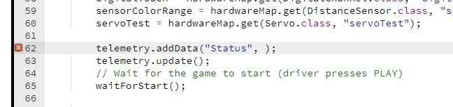 When you first attempt to build the op mode, you should get an “illegal start of expression error”. This is because the addData method is missing its second argument. The OnBot Java system also directs you to the file that has the error, and the location within the file where the error occurs.