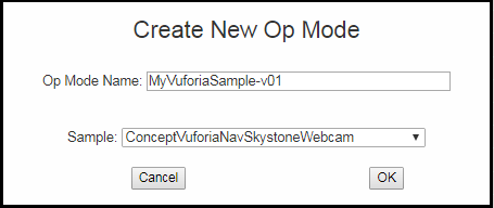 On a laptop connected via Wifi to the RC phone or REV Control Hub, at the Blocks screen, click Create New Op Mode. Type a name for your example program, and choose the appropriate Vuforia sample. If using the RC phone’s camera, choose the first Sample shown below.