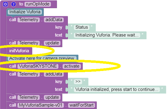 Besides the Telemetry messages, this section has only two actions, circled above: initialize Vuforia (specify your settings), and activate Vuforia (turn it on). The first action’s Block is long enough to justify its own Function called ‘initVuforia’, shown below the main program.