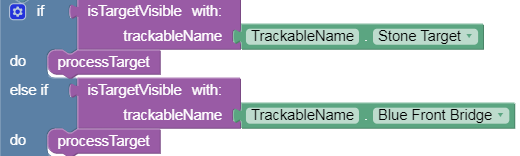 Inside the loop, the program checks whether Vuforia has found specific pre-loaded images. This example Op Mode checks one at a time, in the order listed, re-using a Function called ‘isTargetVisible’. If a match is found, this program performs an action with another Function called ‘processTarget’. The first two searches are shown here: