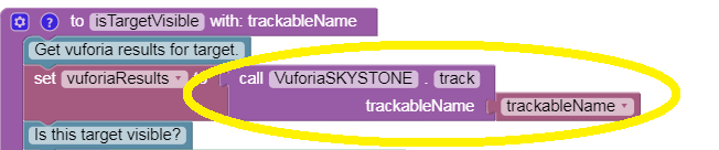 The FTC Vuforia software contains a method called ‘track’. This is the central task; it looks for a specific image named as an input parameter. The yellow-circled command calls that method, passing it the same parameter from the main program: trackableName.