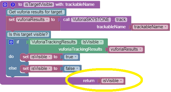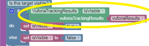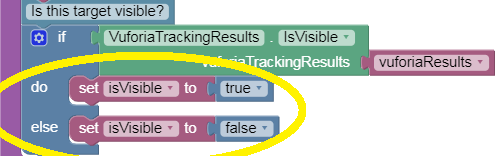 The yellow-circled command calls a different Vuforia method called ‘IsVisible’. This method examines the full set of tracking results, now stored in the variable ‘vuforiaResults’, and determines whether a target was recognized in the camera image. It returns a Boolean value of True or False.