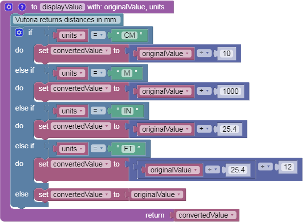 The fourth and last function receives a Vuforia distance value (in millimeters) as a parameter and converts it to another unit, specified as a second parameter.