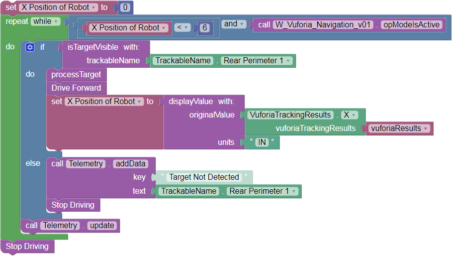 Next the Op Mode enters a Repeat loop that includes all the Vuforia-related commands. In this Sample, the loop continues while the Op Mode is active, namely until the Stop button is pressed.