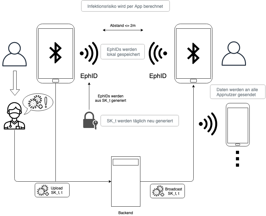 Das Hauptziel des Proximity Tracings besteht darin, die Menschen zu benachrichten, wenn sie in unmittelbarer physischer Nähe einer infizierten Person waren, ohne die Identität des Kontakts oder den Ort, an dem dieser Kontakt stattgefunden hat, preiszugeben. Dieses Ziel wird dadurch erreicht, dass Menschen sich freiwillig melden können, wenn bei ihnen das COVID-Virus diagnostiziert wurde. Dies sollte nur mit der Zustimmung einer Gesundheitsbehörde und der ausdrücklichen Erlaubnis des Benutzers erfolgen. Wenn der Benutzer nichts hochgeladen hat, bleiben alle Daten ausschliesslich auf dem Smartphone des Benutzers. Benutzer, die dieses System verwenden, führen eine Smartphone-App aus, die eine häufig wechselnde, kurzlebige ID (ephemeral identifier - EphID) broadcastet, die den Benutzer repräsentiert, und auch EphIDs aufzeichnet, die von Smartphones in unmittelbarer Nähe beobachtet werden. Die App kann die anonymen Daten vom Server verwenden, um lokal zu berechnen, ob sich der Benutzer der App in physischer Nähe zu einer infizierten Person befand. Stellt die App ein hohes Risiko fest, dass eine Begegnung zu einer infizierten Person stattgefunden hat, informiert sie den Benutzer. Keine Aussagen lassen sich treffen über den genauen Ort des Kontaktes sowie über die Identität des Infizierten. Darüber hinaus ermöglicht das System den Benutzern, Gesundheitsexperten auf freiwilliger Basis und unter Wahrung der Privatsphäre Informationen zur Verfügung zu stellen.