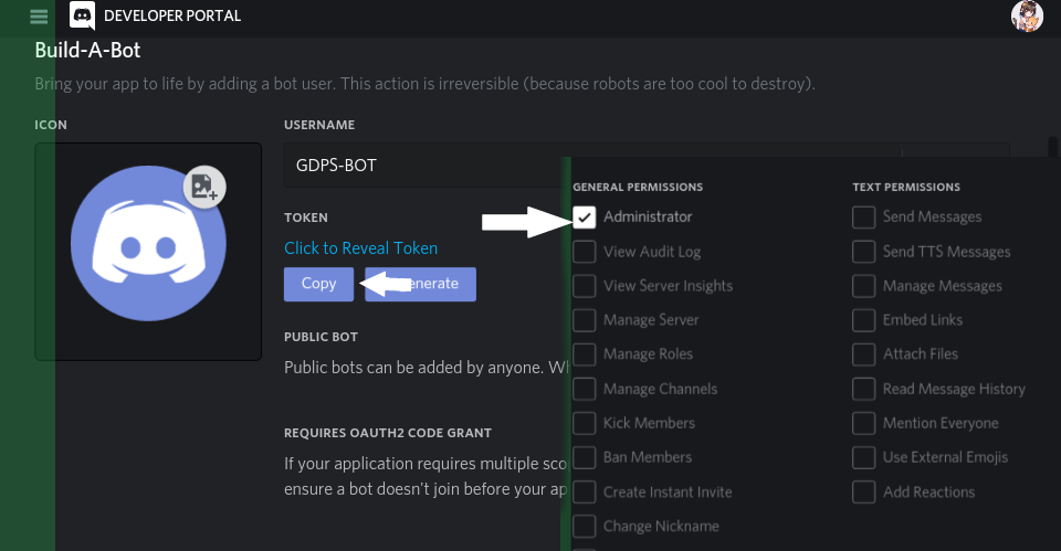 Copy your token bot and set bot permission to admin