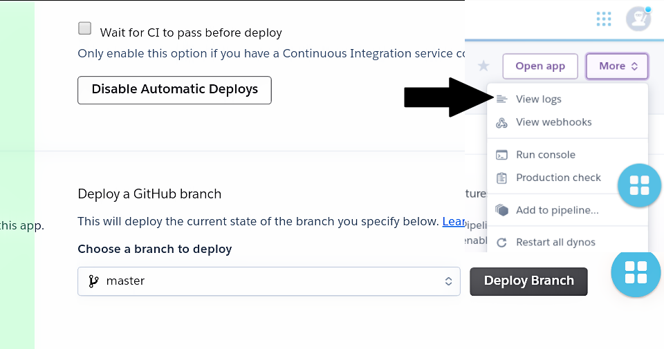 After you connect and clone your repo. Tap Deploy Branch to cloning and running the bot. After done deploying. Goto more at up site and goto view logs to see the bot is Online or not.