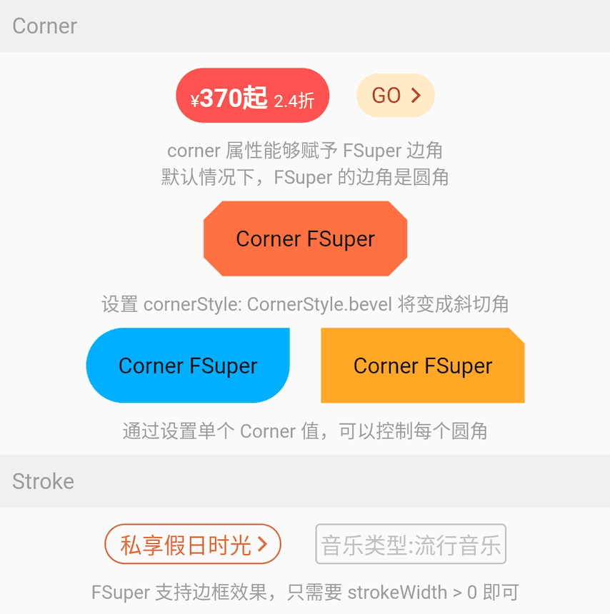 FSuper The first part of the text is set through the text property, and related text style properties can be set. If you want to achieve rich text effects, you can pass a TextSpan array via the spans property.