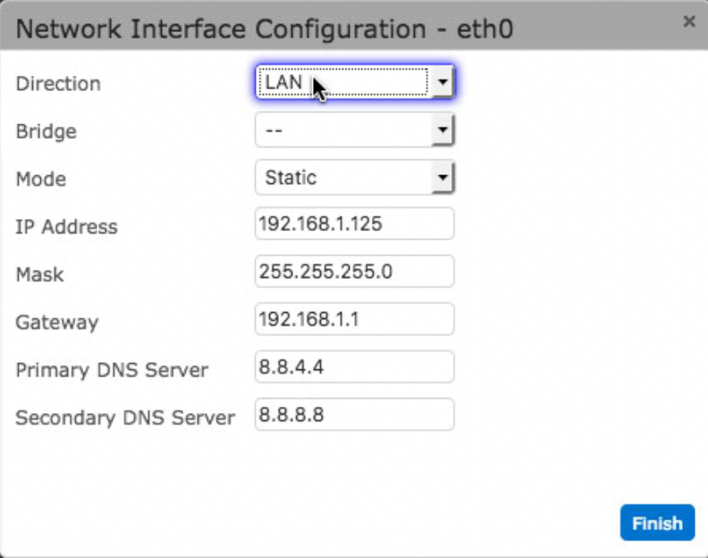 A single Multitech Conduit gateway is connected to a wired Ethernet port on the same LAN as Floranet server. To configure an IP address on the interface, login to the gateway's web interface and perform the following steps: