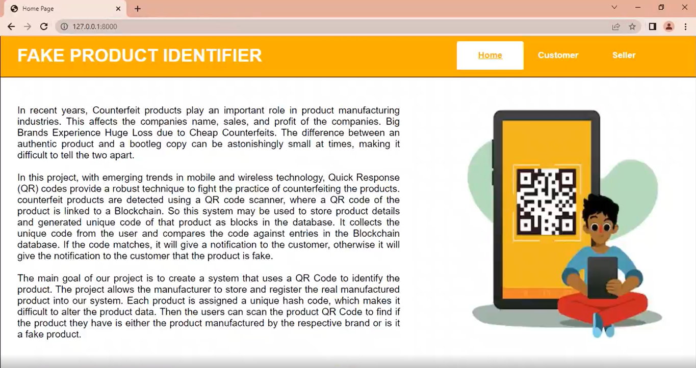 In today's world where product duplication is a very common phenomenon, we have tried our bit to create a system which can up to some extent avoid the selling and usage of counterfeit products. Our portal is quite simple and easy to use - the sellers or manufacturers registering their products with us for the first time will have to verify their company by providing the CIN (CORPORATE IDENTIFICATION NUMBER) and all the other necessary information; once verified they can register their products and get a unique QR Code for each product. Each QR Code generated holds a Unique HASH VALUE, which makes it almost impossible to counterfeit them. The customer can easily scan the QR Code or can upload the image of QR Code on our web application and can verify the authenticity of the product!