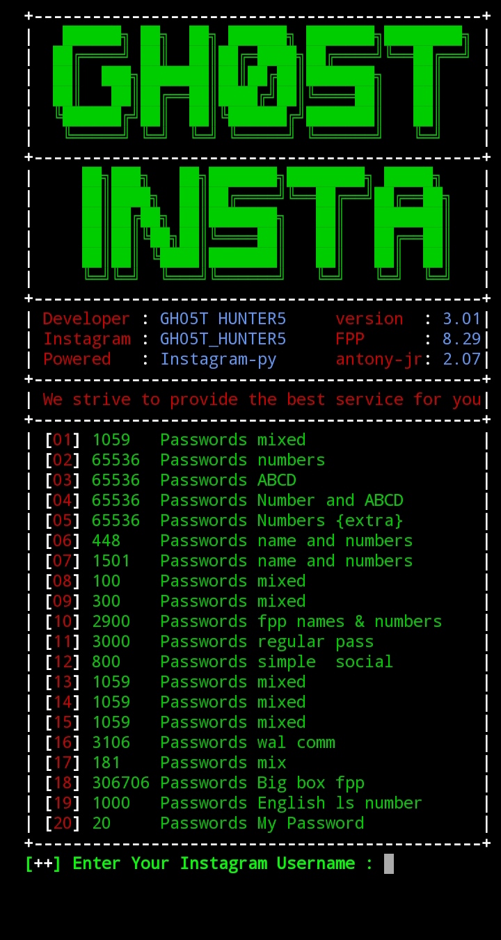 Usage of GH05T-INSTA for attacking targets without prior mutual consent is illegal. It's the end user's responsibility to obey all applicable local, state and federal laws. Developers assume no liability and are not responsible for any misuse or damage caused by this program