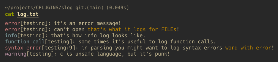 And your colors for logging by defining: [MY_SLOG_MESSAGE_COLOR, MY_SLOG_ERROR_COLOR, MY_SLOG_WARNING_COLOR, MY_SLOG_INFO_COLOR]. The default values are: [SLOG_YELLOW, SLOG_RED, SLOG_RED, SLOG_MAGENTA, SLOG_BLUE] respectively