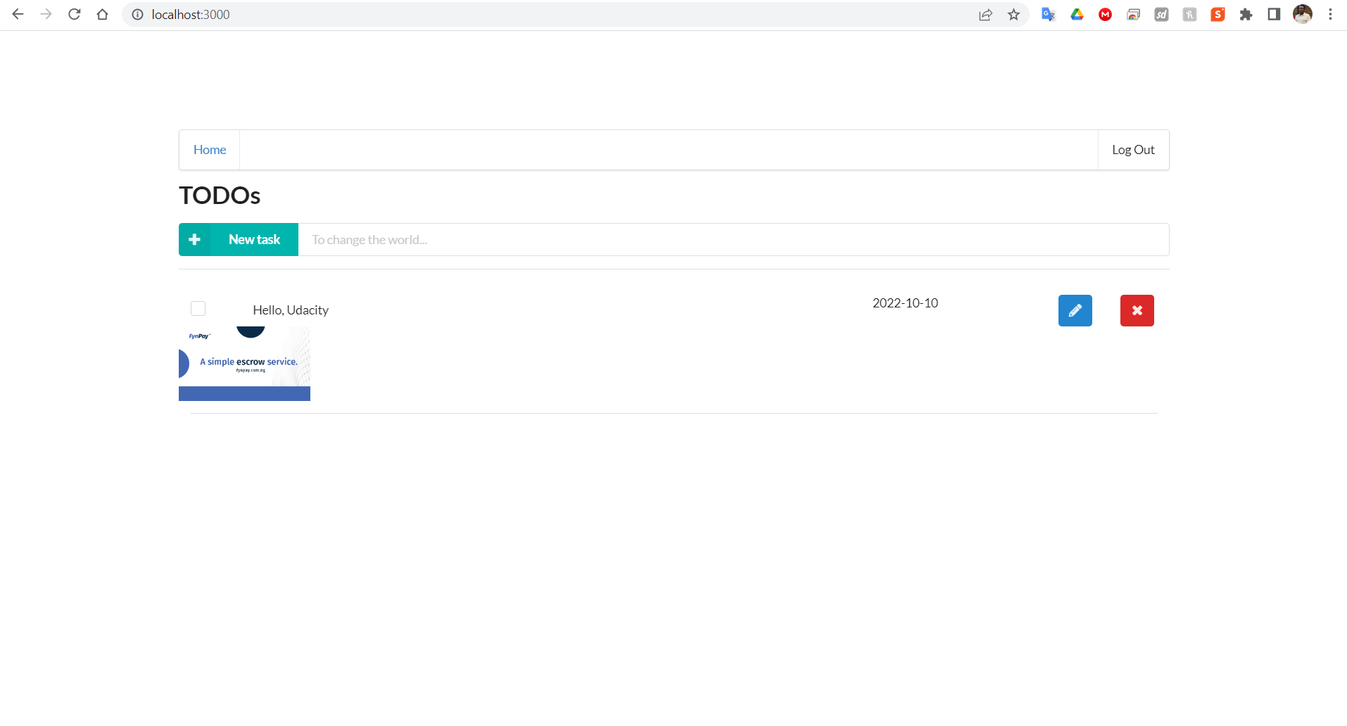 Auth- this function should implement a custom authorizer for API Gateway that should be added to all other functions.GetTodos- should return all TODOs for a current user.CreateTodo- should create a new TODO for a current user. A shape of data send by a client application to this function can be found in theCreateTodoRequest.tsfileUpdateTodo- should update a TODO item created by a current user. A shape of data send by a client application to this function can be found in theUpdateTodoRequest.tsfileDeleteTodo- should delete a TODO item created by a current user. Expects an id of a TODO item to remove.GenerateUploadUrl- returns a presigned url that can be used to upload an attachment file for a TODO item.