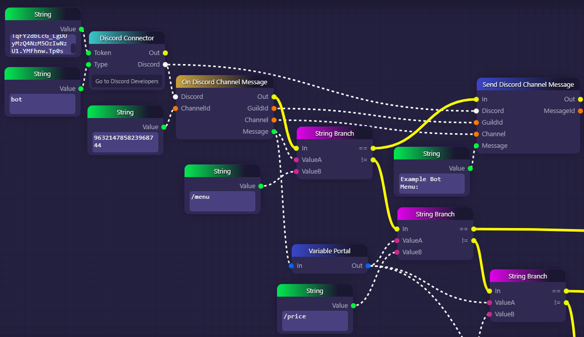 In the example above, we start by setting up a Discord API connection through a bot we control by passing our bot's token to a Discord Connector block. Then, we use an On Discord Channel Message block to listen to every message sent in our Discord channel. Each time it detects a message, it sends it to a String Branch block where it is compared to the string "/menu". In the case that our user's message does equal "/menu", then we execute a Send Discord Channel Message block that we can imagine sends a message in the Discord channel that displays a menu of all the bot commands we offer.