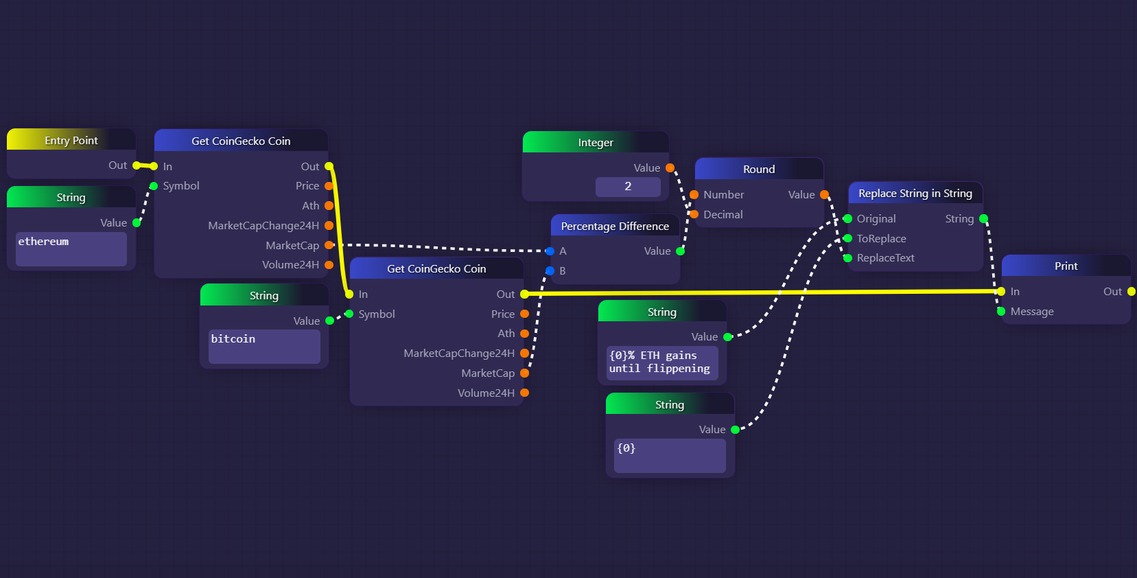 In the example above, we use a Percentage Difference block to compare the market capitalizations of ETH and BTC in order to calculate what percentage ETH needs to gain before it flips BTC's market cap.