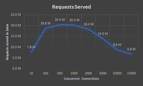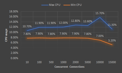 | Concurrent Connections | Requests Served | Max heap | Min heap | Peak CPU (connecting) | Max CPU | Min CPU |