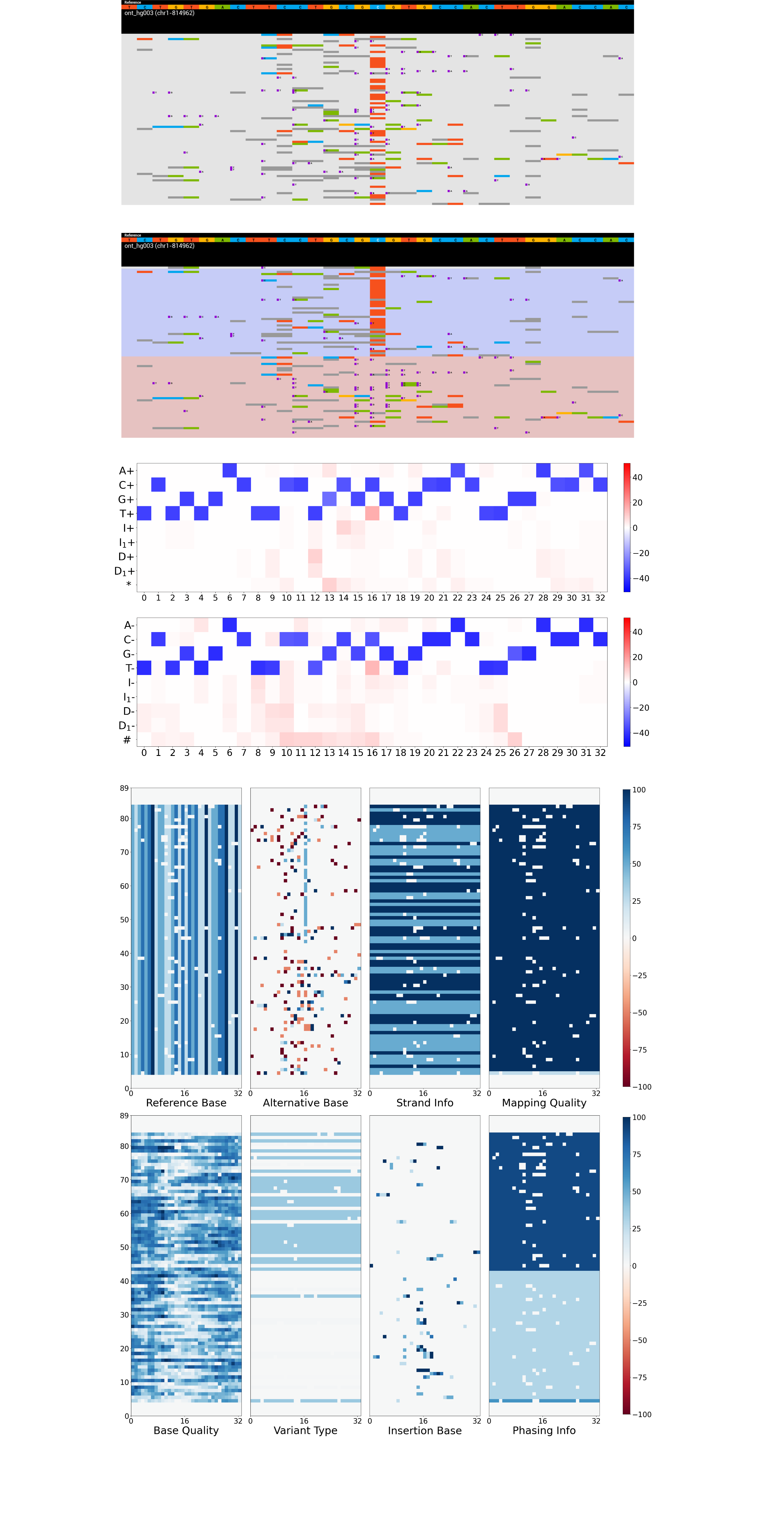 Visualization includes 1) unphased read alignments, 2) phased read alignments, 3) pileup model input, and 4) full-alignment model input. In terms of the colors in the reads alignment, bases A, C, G and T are in green, blue, yellow, and red, respectively. Insertions and deletions are in purple dots and dark grey. The phased alignments of two haplotopes are marked in two colors (lavender and pink). The color intensity represents the strength of a signal in both the pileup and full-alignment model input. Check the demo below: